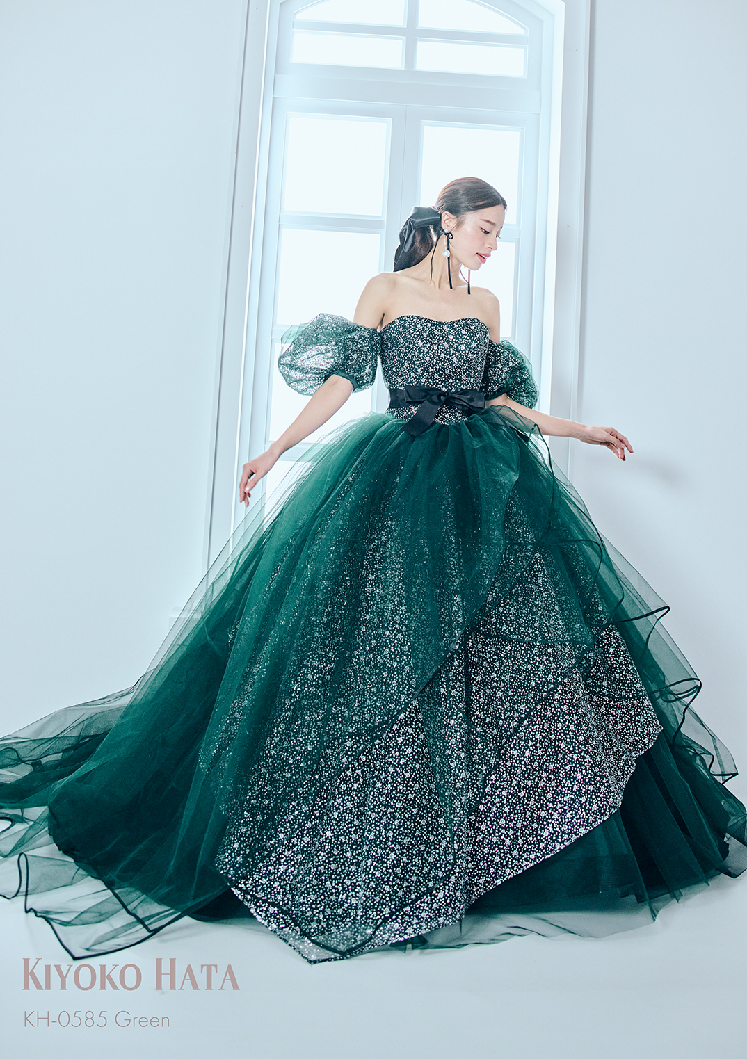 特に人気なのは、光を纏うようなグリッターチュールや、ふんわりとしたドロップショルダーのデザイン。可憐さと華やかさを両立したスタイルは、SNSでも「#KIYOKOHATAドレス」で多くの花嫁が憧れる存在となっています。